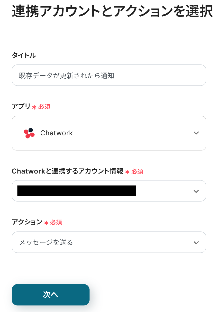 続いて、Chatworkに通知する設定を行うため、「既存データが更新されたら通知」をクリックしてください。