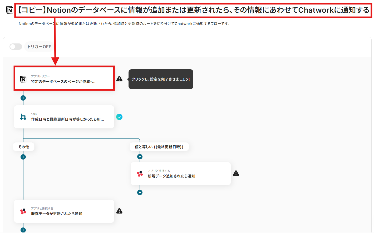 Notionへのデータ追加と更新を分けてデータをChatworkに通知するフローとなっています。