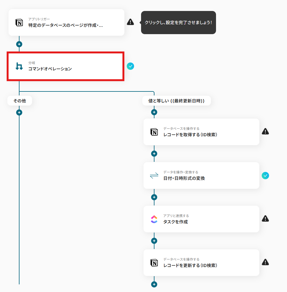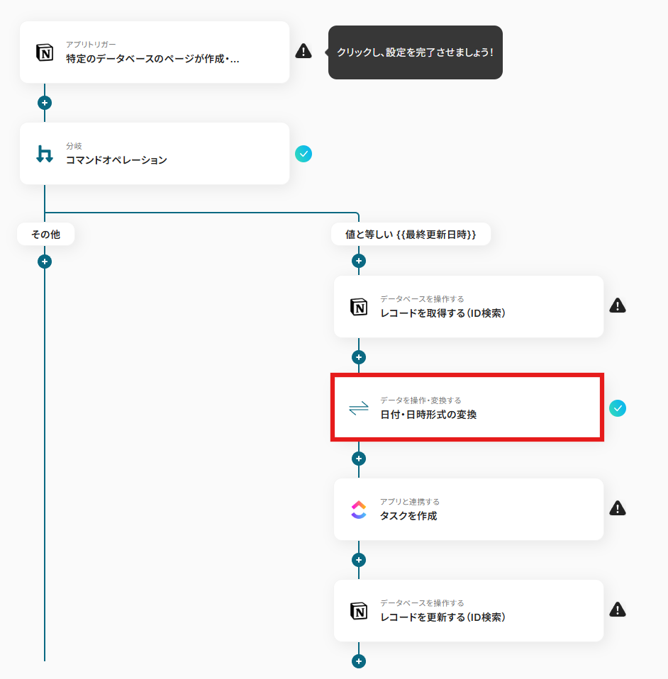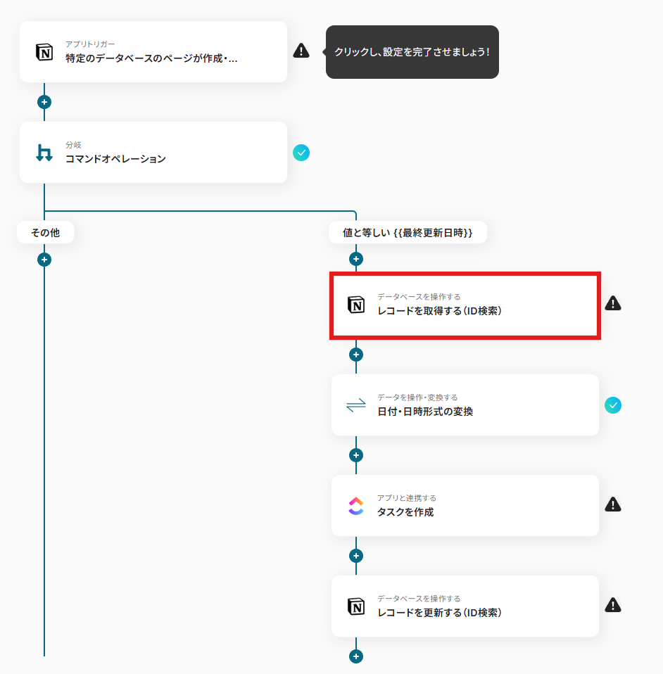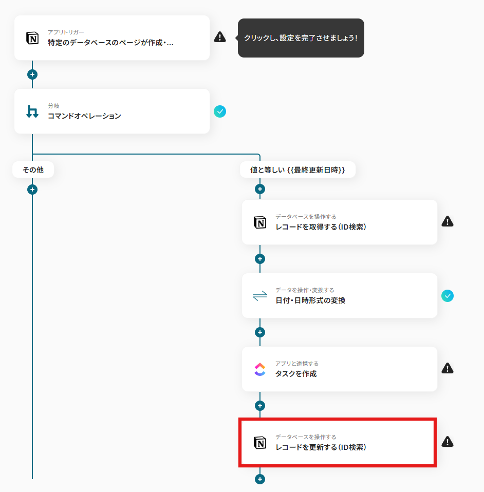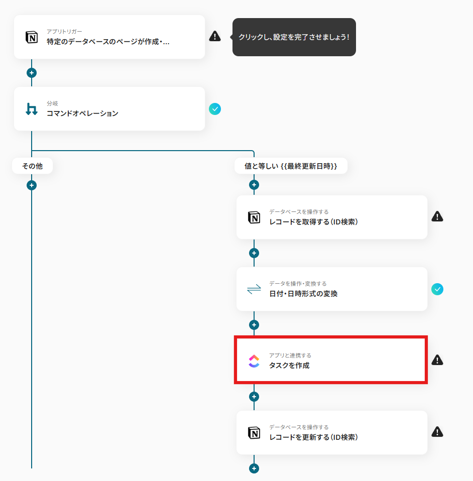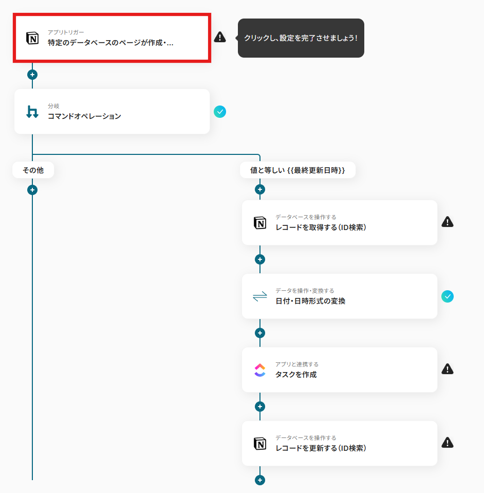 「Notionの特定のデータベースでページが作成されたらClickUpにタスクを作成する」フローは、NotionとClickUpの連携を自動化する業務ワークフローです。