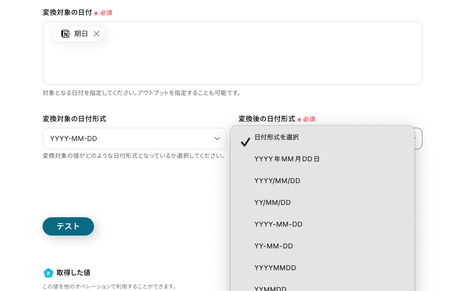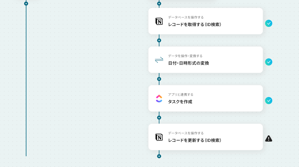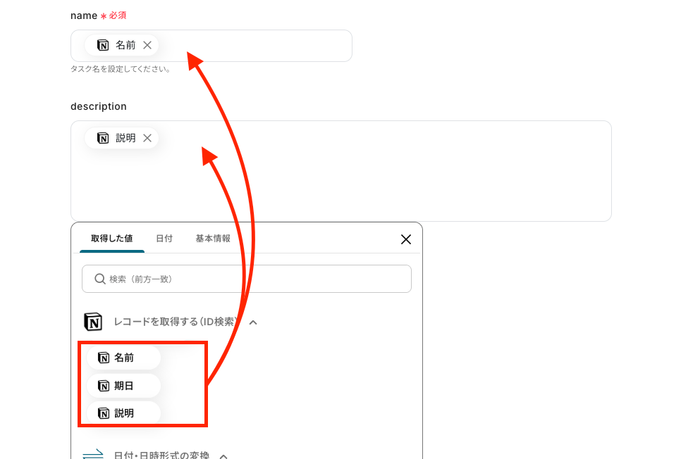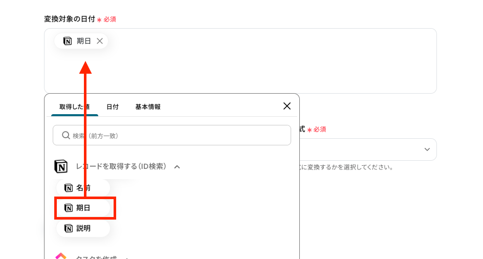 - 必要に応じて「日付・日時形式の変換」アクションを使用し、Notionの日付データをClickUpの形式に合わせます。