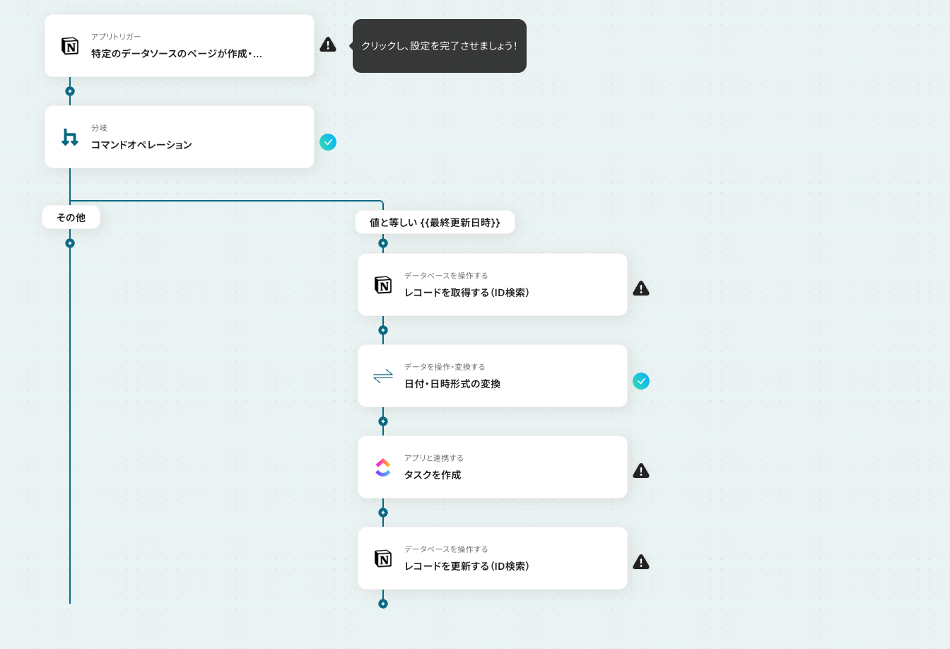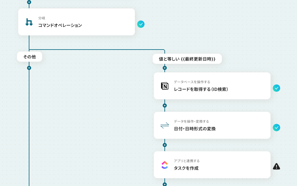 - 必要に応じて「分岐」や「日付・日時形式の変換」といったオペレーションを組み合わせ、ClickUpに登録する情報を整理します。
