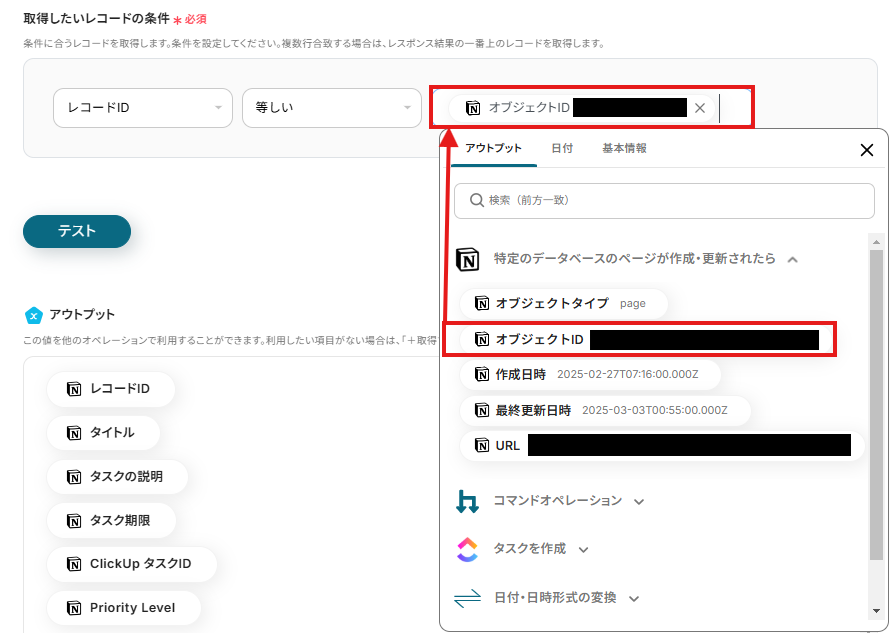 「更新したいレコードの条件」は、入力欄をクリックして表示されるアウトプットから選択してください。