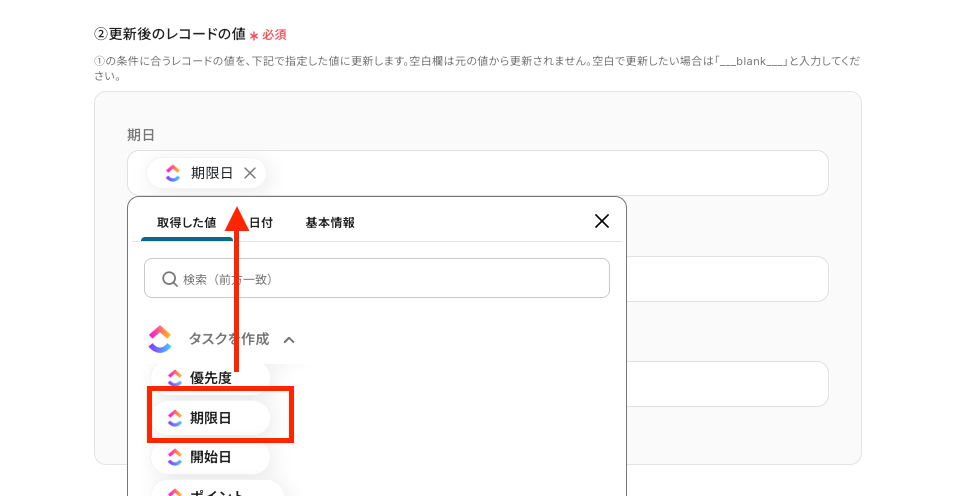 - 最後に、オペレーションでClickUpの「タスクを更新」アクションを設定し、Notionから取得した情報をもとに該当タスクを更新します。