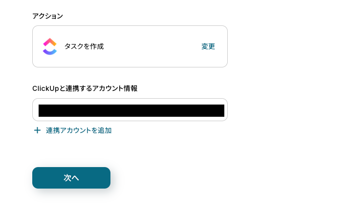 - 分岐の条件に合致したタスクを、ClickUpの「タスクを作成する」アクションで登録します。