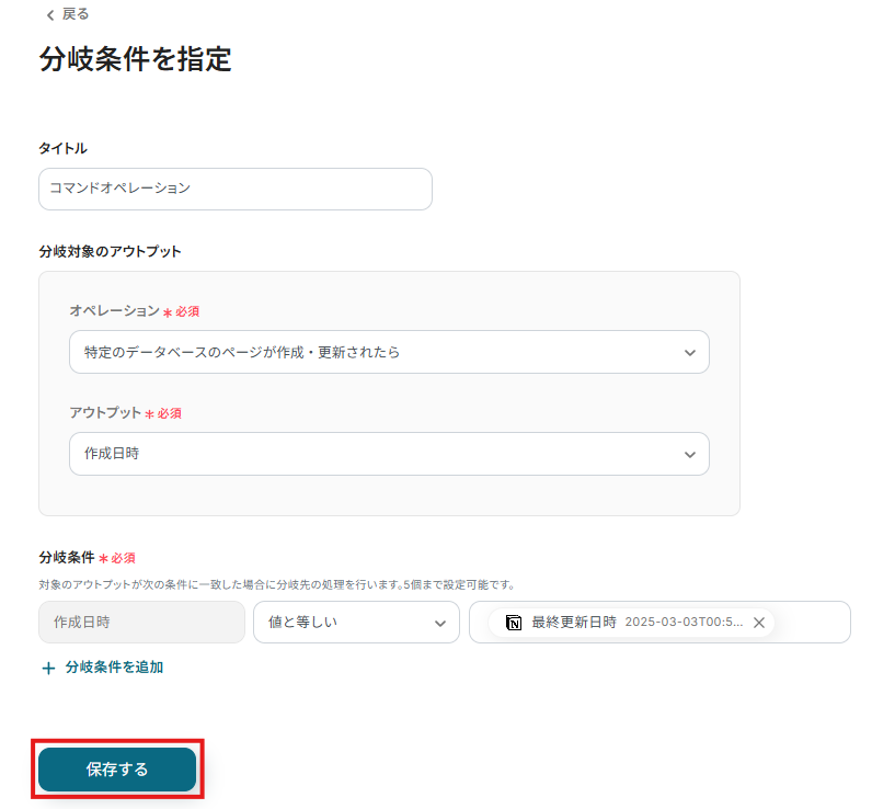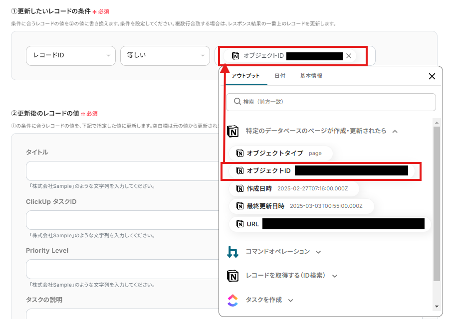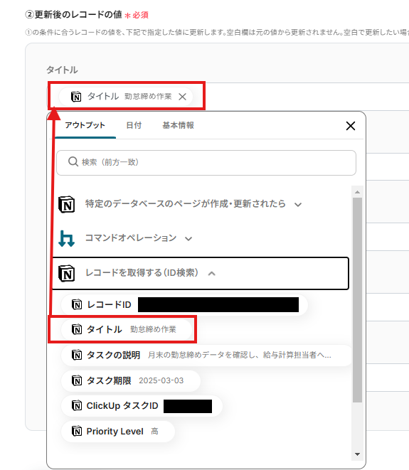 「更新後のレコードの値」は、入力欄をクリックして表示されるアウトプットから選択してください。