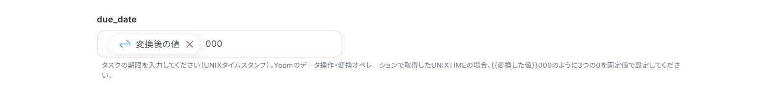 ・ClickUpへの日程の登録はUNIXタイムスタンプ形式で入力する必要があるため、データを操作変換するオペレーションを追加しています。
