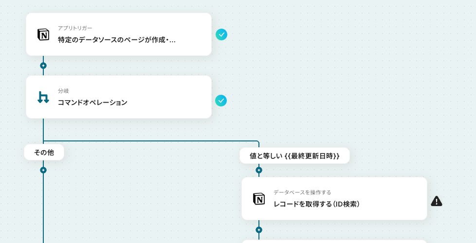 - 最後にNotionの「レコードを更新する」アクションで、登録済みのタスクにチェックを入れるなど、処理済みであることが分かるように更新します。