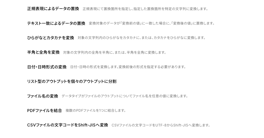 - その後、必要に応じて「正規表現によるデータの抽出」や「日時・日時の加算減算」といったオペレーションで、取得した情報を加工します。