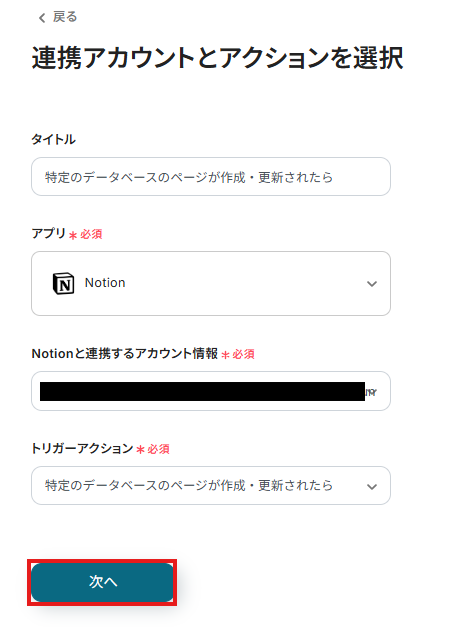 2.表示された画面で必須項目を入力します。トリガーアクションはそのままにして、「次へ」をクリックしましょう。