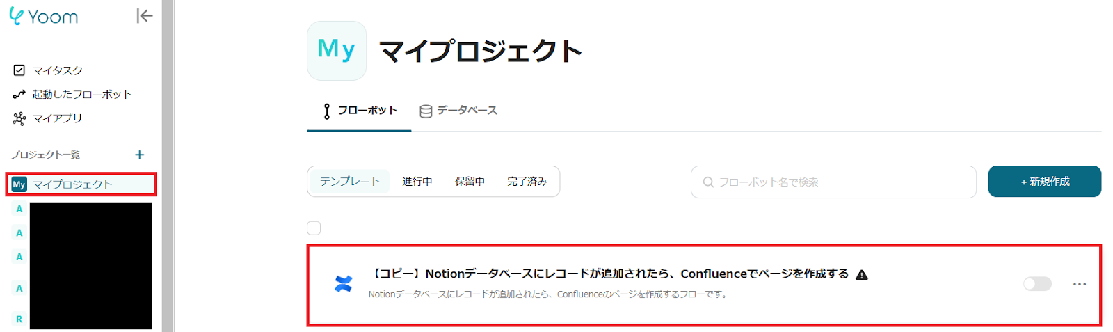1.Yoom管理画面の「マイプロジェクト」を選択し、「【コピー】Notionデータベースにレコードが追加されたら、Confluenceでページを作成する」をクリックします。
