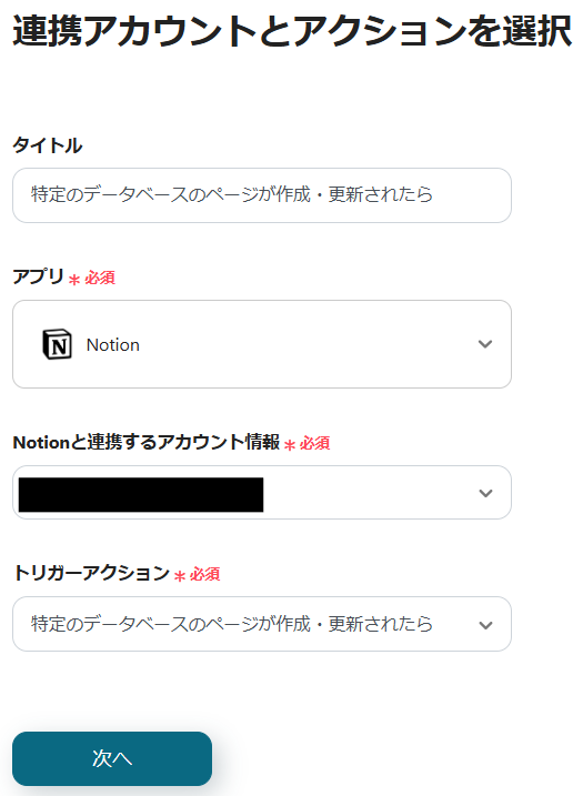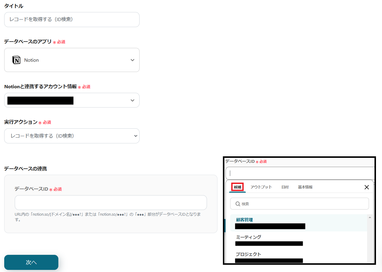 2.Notionと連携するアカウントを確認し、データベースIDを設定した後、「次へ」をクリックします。
