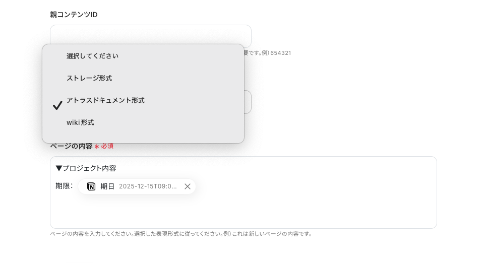 ※コンテンツの表示形式は「ストレージ形式」「アトラスドキュメント形式」「wiki形式」から選択します。アトラスドキュメント形式を選択する場合は、NotionにJSON(JavaScript Object Notation)ベースで記述されている必要があります。