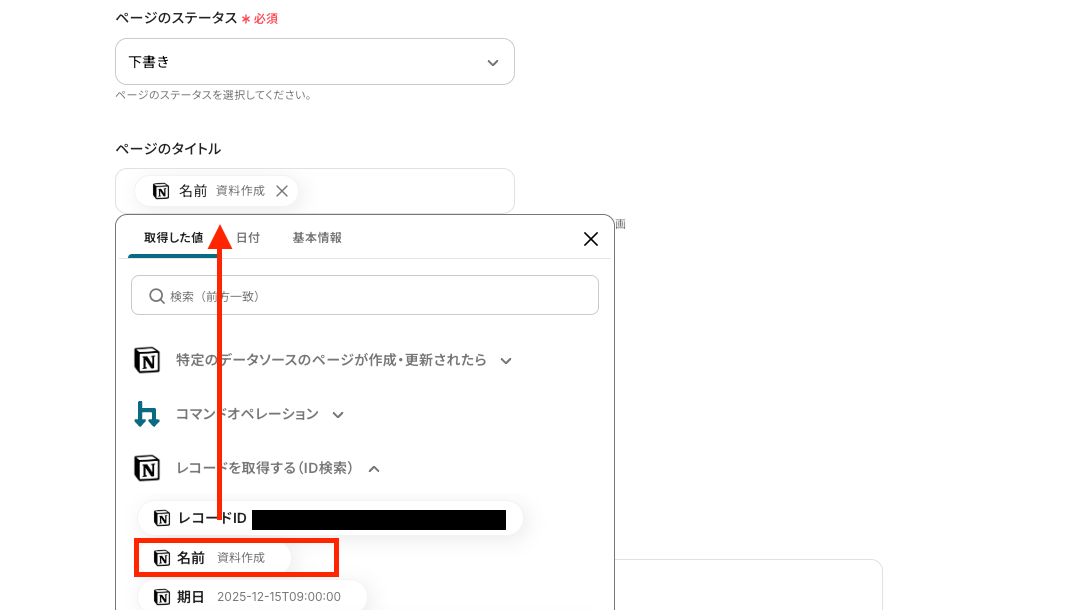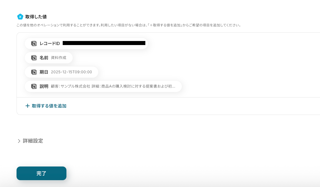 - 次に、オペレーションでNotionの「レコードを取得する(ID検索)」を設定し、作成されたページの詳細情報を取得します