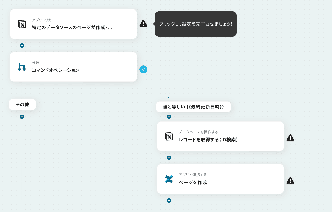 - 続けて、オペレーションで分岐機能を設定し、ページの作成時と更新時で処理を分けます