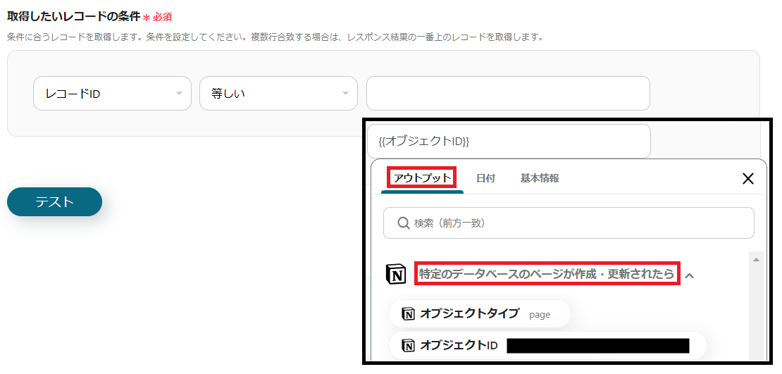 3.取得したいレコードの条件で、右側の枠にステップ2で取得したオブジェクトIDを設定し、テストを行います。
