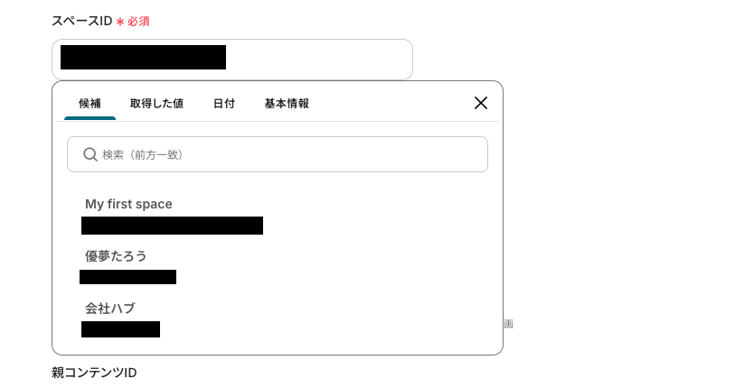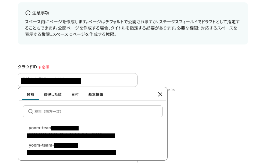 ※クラウドID、スペースIDは枠をクリックして表示される「候補」から選択できます。