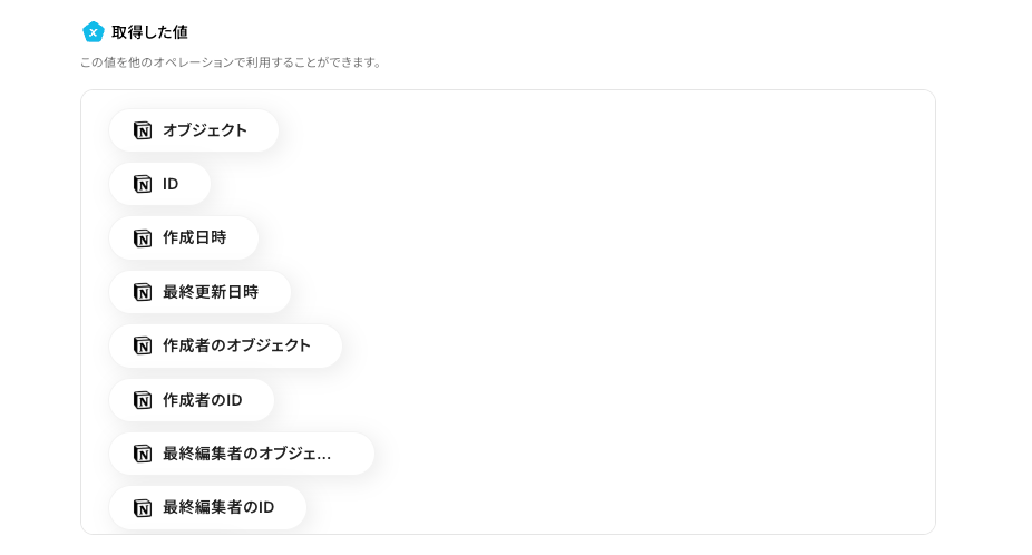 - Notionの「ページを作成」オペレーションでは、Confluenceから取得したページのタイトルや本文などの情報を、作成するページの任意の場所(タイトルや本文、プロパティなど)に変数として埋め込むことができます
