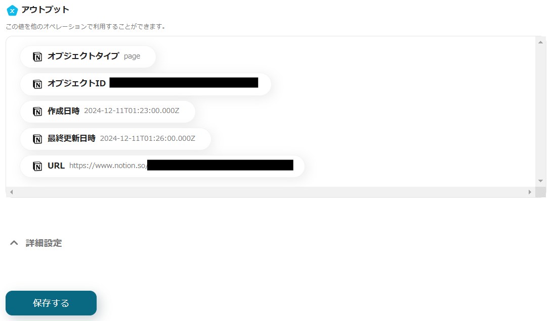 ※オブジェクトIDは枠をクリックして表示されるアウトプットの「特定のデータベースのページが作成・更新されたら」から選択します。(値は二重括弧で表示されます)