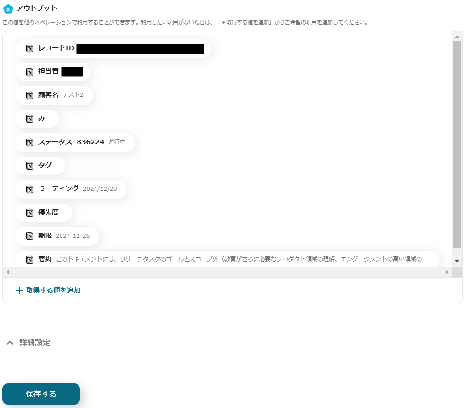 4.テストが成功すると、Notionから取得した情報がアウトプットに表示されます。