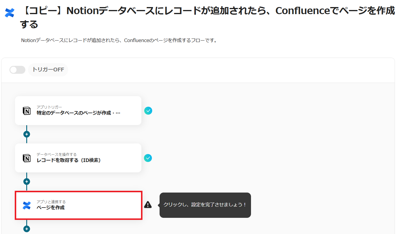 5.トリガーをONにすると、以降はNotionデータベースにレコードが追加されたら、自動でConfluenceにページが作成されます。