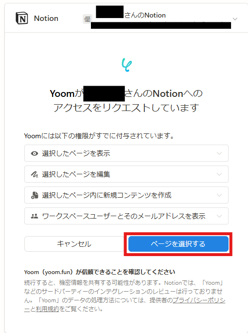 Notionのアクセス画面になるので、ページを選択するをクリックします。
