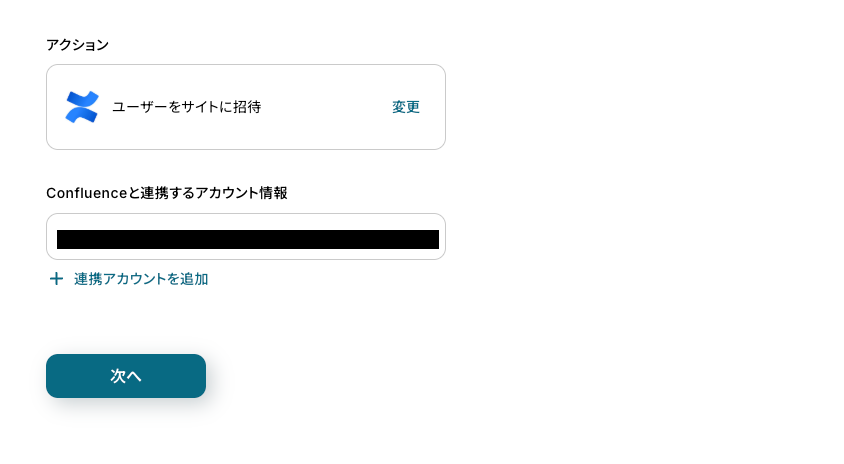 連携アカウントとアクションを選択の画面が表示されるので、今回連携するConfluenceのアカウントで間違いないか確認し、「次へ」をクリックします。