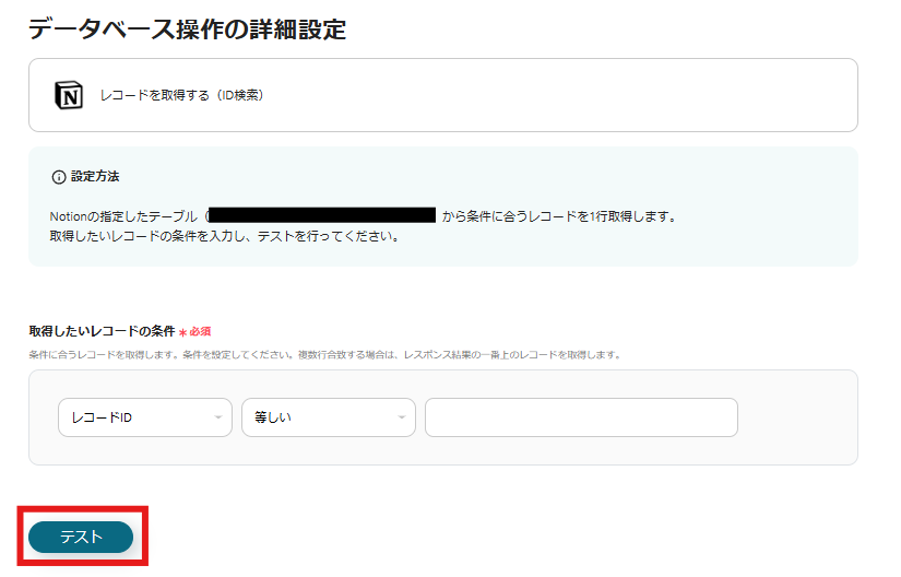 取得したいレコードの条件を入力し、「テスト」を実行し、テスト完了の確認ができたら「保存する」をクリックしましょう。