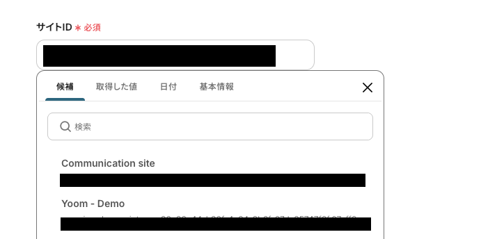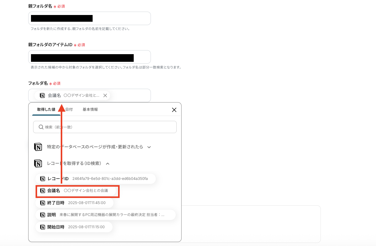 (3)「API接続設定」画面から、各項目に入力をします。 ・サイトID:候補から選択 ・ドライブID:候補から選択 ・親フォルダ名:手動入力 ・親フォルダのアイテムID:候補から選択(親フォルダ名を正しく入力することで『候補』に情報が展開) ・フォルダ名:『取得した値』から選択(※今回は、会議の資料を作成したフォルダに格納することを想定して作成しています。)