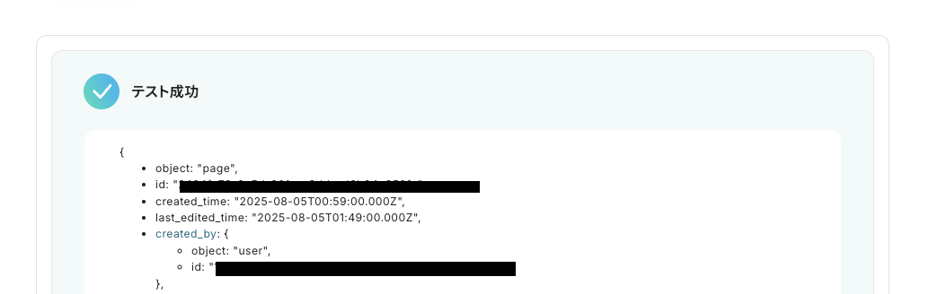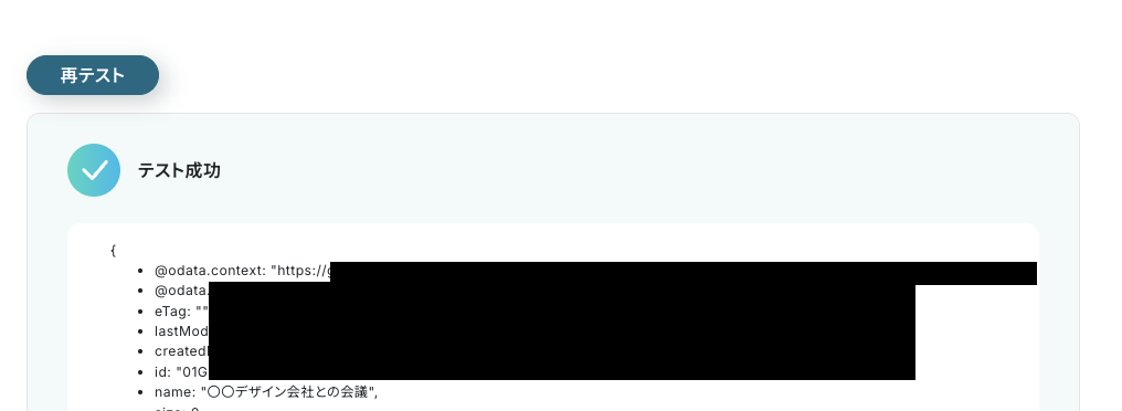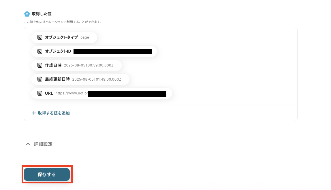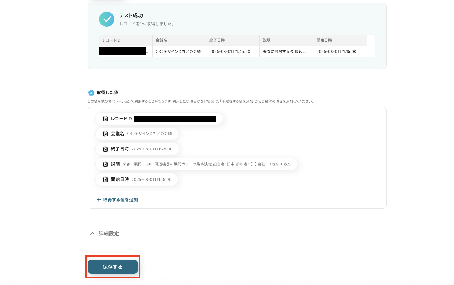 テスト完了を確認して『保存する』を押しましょう。 このステップで下記のような情報を取得することが可能です。この情報は後続のアクションで利用できます。※ 取得した値とは?