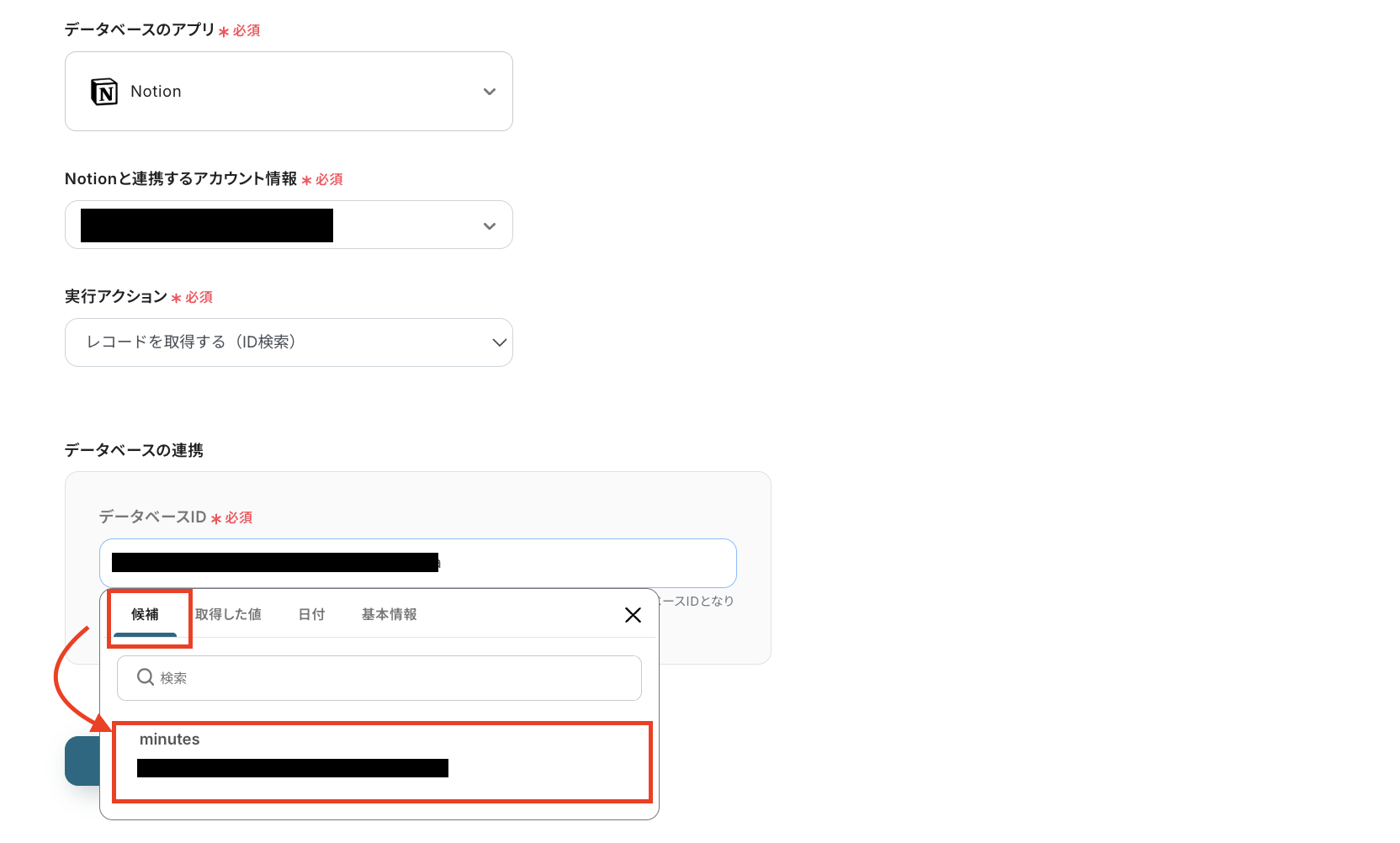 連携するアカウント情報を入力します。 画面下部で、【データベースID】を候補から選択・入力して「次へ」をクリックしましょう。