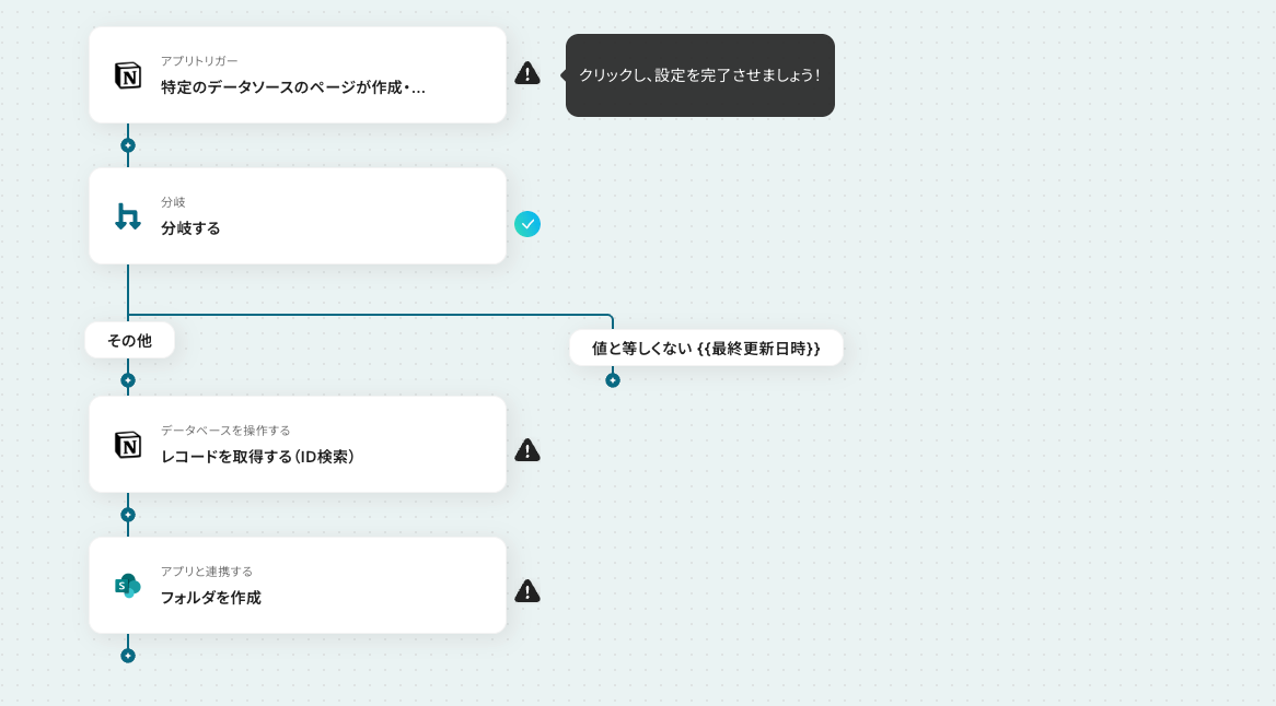 はじめに、NotionとMicrosoft SharePointをYoomと連携します トリガーでNotionを選択し、「特定のデータソースのページが作成・更新されたら」というアクションを設定します 次に、オペレーションで分岐機能を設定し、トリガーの起動が「作成」によるものだった場合のみ後続の処理に進むようにします 次に、オペレーションでNotionの「レコードを取得する(ID検索)」アクションを設定し、トリガーで取得したページの詳細情報を取得します 最後に、オペレーションでMicrosoft SharePointの「フォルダを作成」アクションを設定し、Notionから取得した情報を元にフォルダを作成します ■このワークフローのカスタムポイント