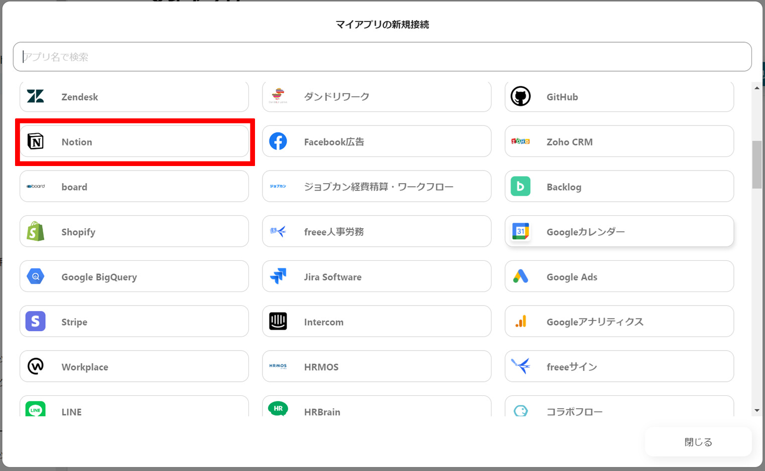 (2)マイアプリの新規接続一覧の中から、Notionをクリックしてください。