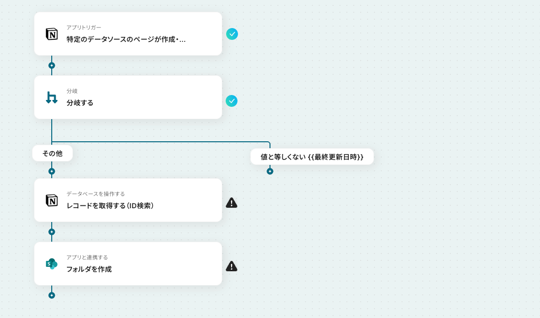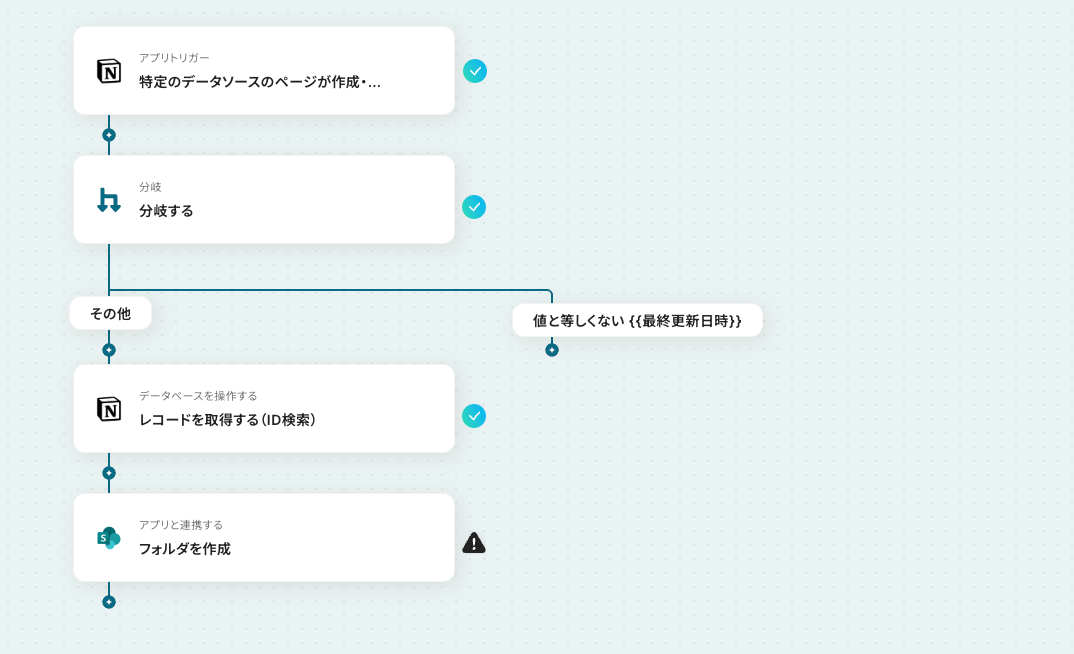 分岐機能では、Notionから取得したページのプロパティ(ステータスなど)を利用して、後続のオペレーションを処理する条件を自由にカスタマイズできます。 Microsoft SharePointでフォルダを作成する際、サイトID・ドライブID・親フォルダを任意で選択し、フォルダ名は固定のテキストやNotionから取得したページのタイトルなどを変数として設定することが可能です。 ■注意事項