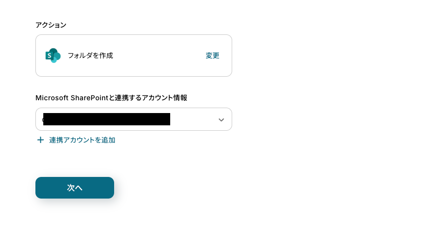 (2)Microsoft SharePointの「連携アカウントとアクションを選択」画面から、Microsoft SharePointと連携するアカウント情報に誤りがないかを確認します。 アクションは「フォルダを作成」のままで「次へ」をクリックしてください。