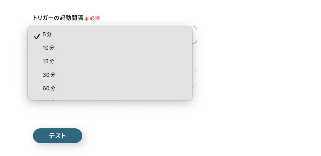 (3)「アプリトリガーのAPI接続設定」画面から、トリガーの起動間隔をプルダウンより選択します。 ※トリガーは5分、10分、15分、30分、60分の間隔で起動間隔を選択できます。 プラン によって最短の起動間隔が異なりますが、基本的に短い設定がおすすめです。
