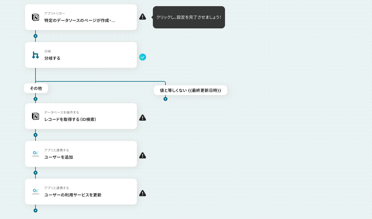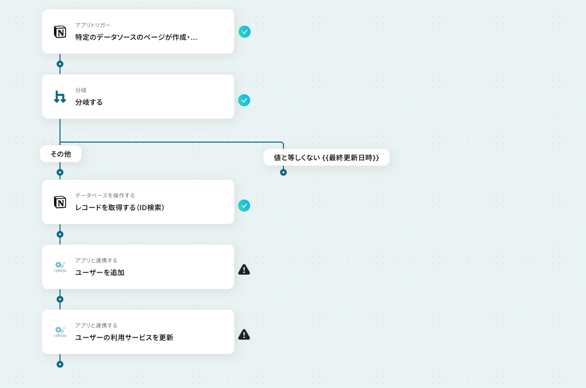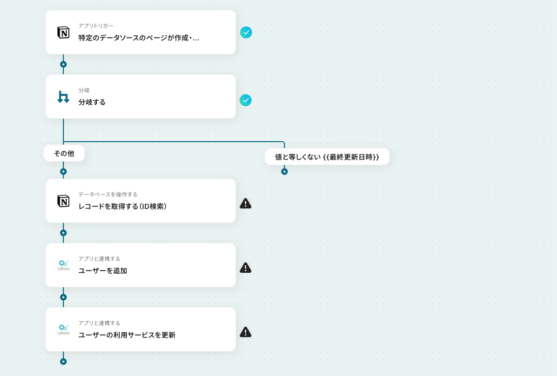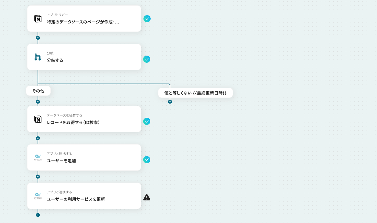 はじめに、Notionとcybozu.com共通管理をYoomと連携します 次に、トリガーでNotionを選択し、「特定のデータソースのページが作成・更新されたら」を設定します 次に、オペレーションの「分岐機能」を使い、新規ページの場合のみ後続の処理に進むよう設定します 続いて、オペレーションでNotionの「レコードを取得する(ID検索)」を設定し、トリガーで検知したページの詳細情報を取得します 次に、オペレーションでcybozu.com共通管理の「ユーザーを追加」アクションを設定し、Notionで取得した情報をもとにアカウントを作成します 最後に、cybozu.com共通管理の「ユーザーの利用サービスを更新」アクションを設定し、作成したユーザーにGaroonやサイボウズ Officeの利用権限を付与します ※「トリガー」:フロー起動のきっかけとなるアクション、「オペレーション」:トリガー起動後、フロー内で処理を行うアクション
