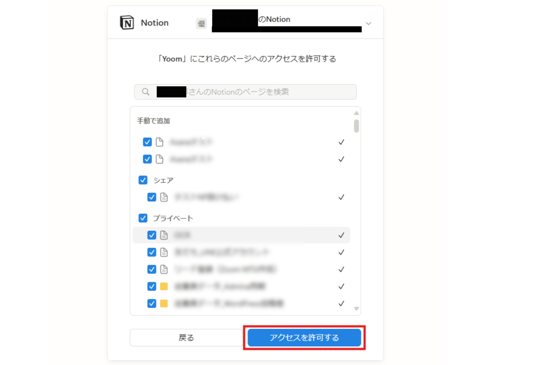 Yoomがアクセスできるページを選択します。