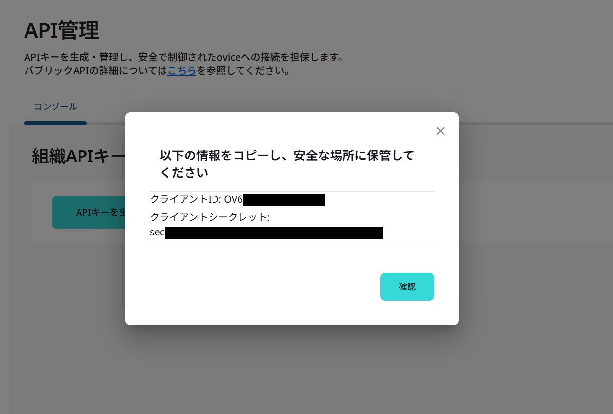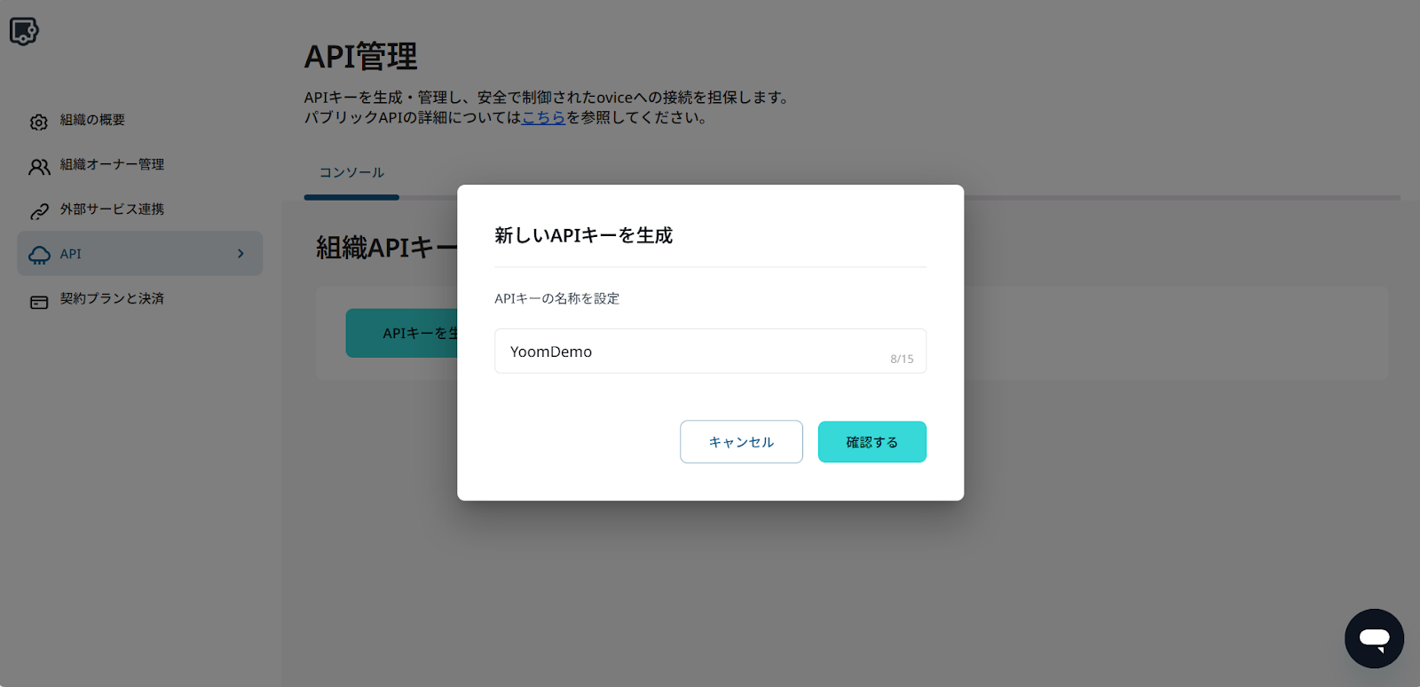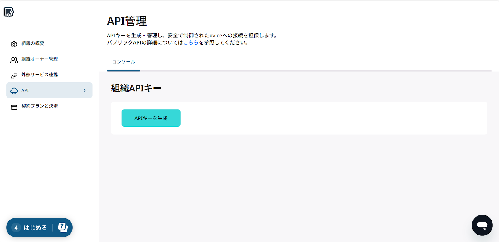 oviceにログインし、左側メニューの「組織の設定」から「API」にアクセス。