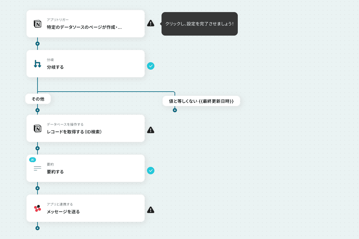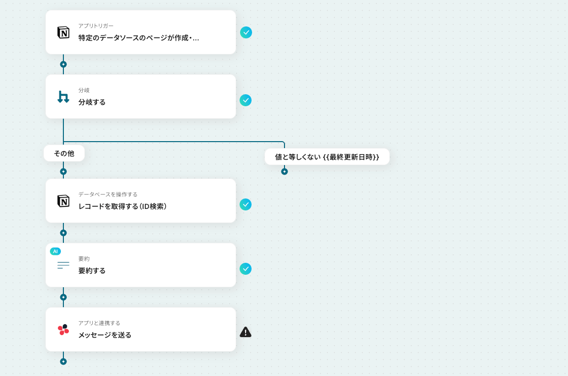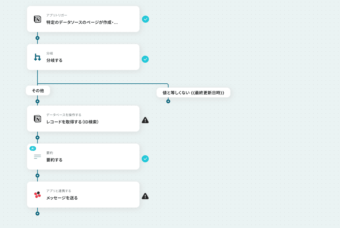 これで「Notionデータベースに登録された議事録の内容を要約してChatworkに通知する」の設定はすべて完了になります。