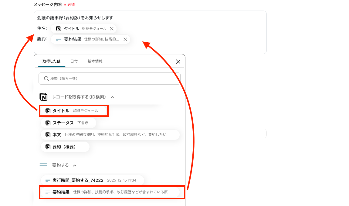 「メッセージ」でも入力欄をクリックして、タイトルや要約結果の値を引用します。