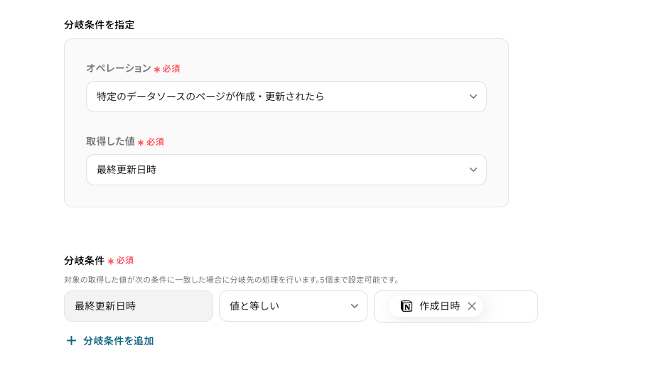 - 分岐機能では、Notionから取得した情報などを用いて、後続の処理を分岐させるための条件を自由に設定できます。