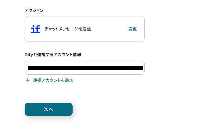 - 次に、オペレーションでDifyを選択し、「チャットメッセージを送信」アクションを設定し、フォームの回答内容をDifyに送信して処理させます。