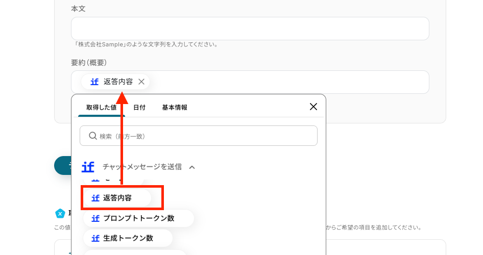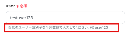 - Difyにチャットメッセージを送信するアクションでは、どのような分析をさせたいかに応じて、プロンプト(ユーザー入力または質問内容)を任意で設定してください。例えば、「この文章の内容から適切なタグを3つ生成してください」といった具体的な指示が可能です。