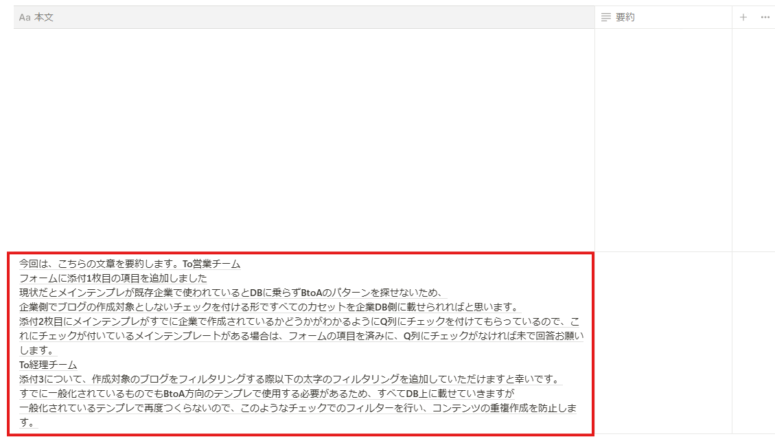 - Notionにページが追加されるとDifyが自動で要約を生成・追記するため、手作業で要約を作成し転記する時間を削減することができます。