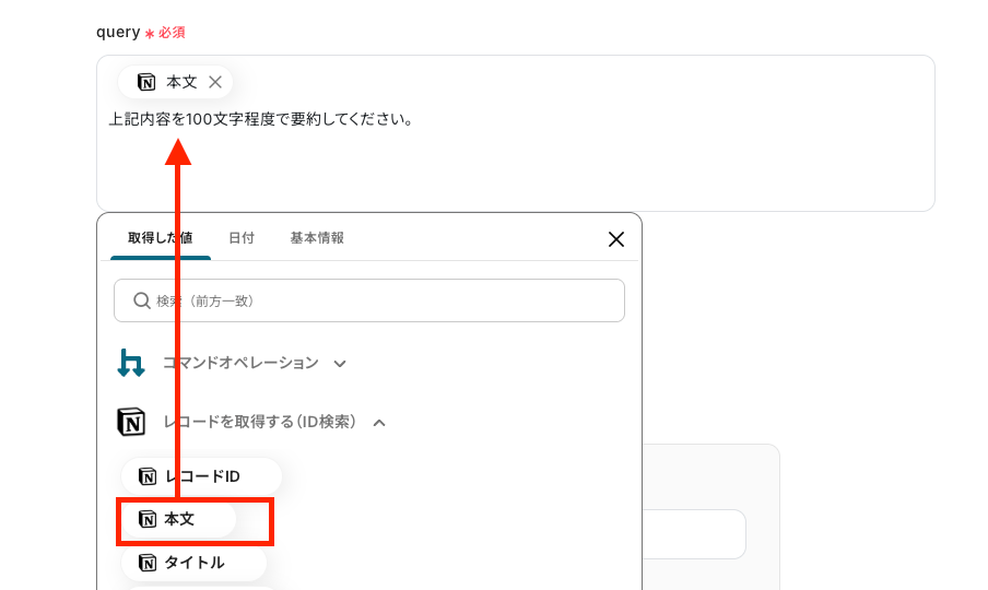 - Notionの「レコードを更新する(ID検索)」では、対象のデータベースIDを指定し、要約を追記したいページの条件や更新後の値を設定してください。