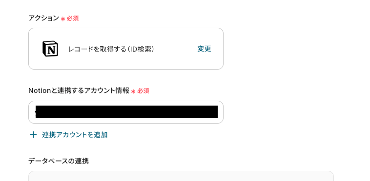 - Notionの「レコードを取得する(ID検索)」では、対象のデータベースIDを指定し、取得したいページの条件を設定してください。