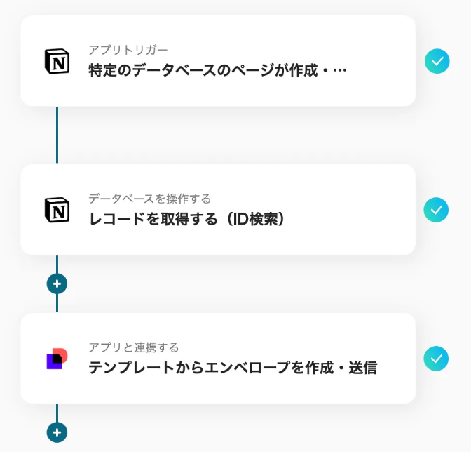 今回、NotionとDocuSignを連携すると、Notionのページが作成・更新された場合、あらかじめDocuSignで用意してある契約書を自動送付可能になります。結果として、テンプレート化された契約を行う際の書類送付が自動化され、事務作業の負担が軽減できるでしょう。