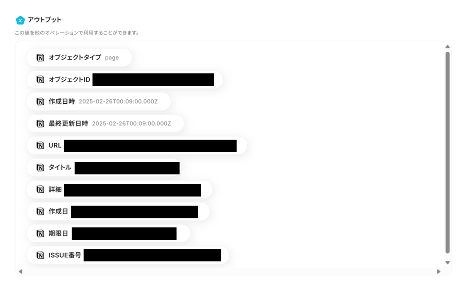 入力が完了したら、「テスト」ボタンをクリックし、Notionの情報がアウトプットに反映されればテスト成功です。