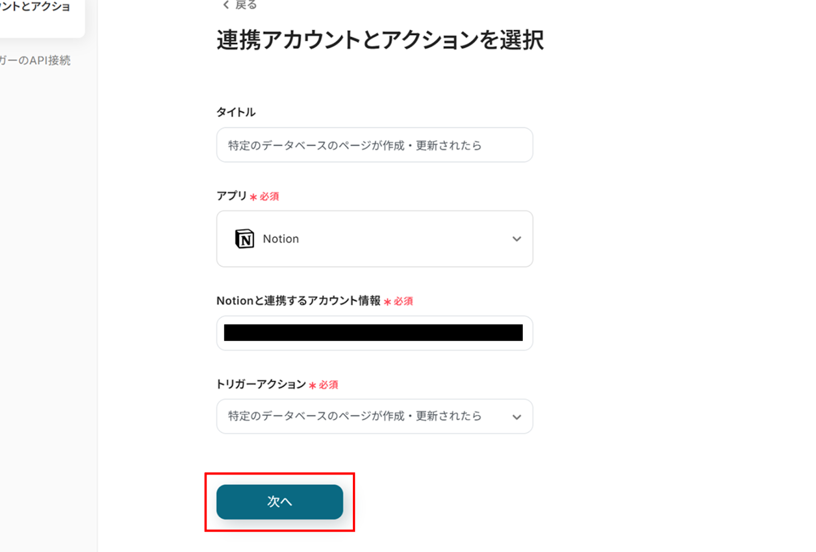 (2)Notionの「連携アカウントとアクションを選択」画面から、Notionと連携するアカウント情報に誤りがないかを確認し、トリガーアクションは「特定のデータベースのページが作成・更新されたら」のままで「次へ」をクリックします。