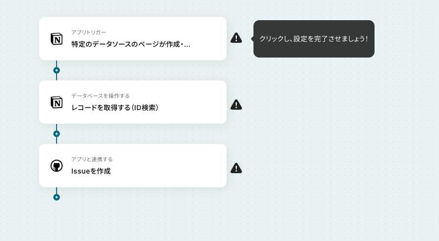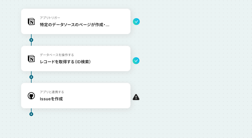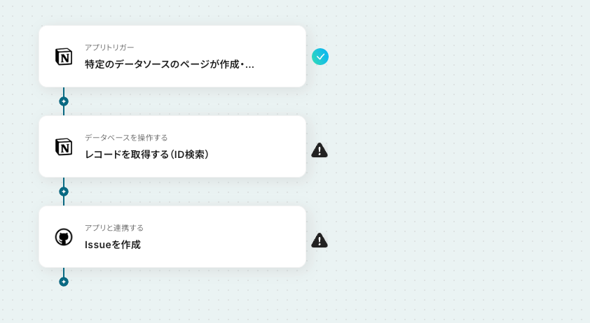 はじめに、NotionとGitHubをYoomと連携します。 次に、トリガーでNotionを選択し、「特定のデータソースのページが作成・更新されたら」というアクションを設定します。 次に、オペレーションでNotionの「レコードを取得する(ID検索)」アクションを設定し、トリガーで検知したページの情報を取得します。 最後に、オペレーションでGitHubの「Issueを作成」アクションを設定し、Notionから取得した情報をもとにIssueを作成します。 ※「トリガー」:フロー起動のきっかけとなるアクション、「オペレーション」:トリガー起動後、フロー内で処理を行うアクション■このワークフローのカスタムポイント